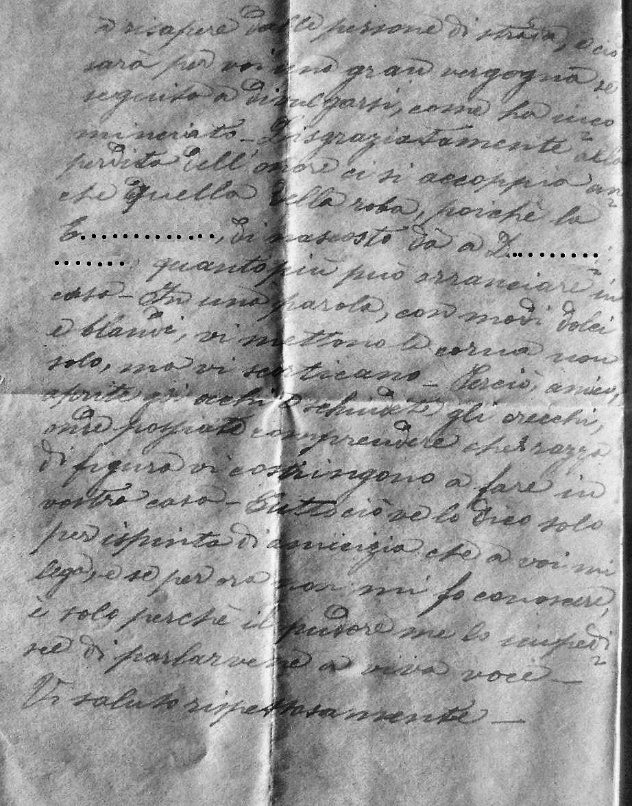 E che diamine! Siete in tutto e per tutto rimbambito e cieco? Ciò che sto per dirvi (e che voi dicasi troppo sapete e sopportate) fa a tutti meraviglia, fuorchè a voi – Vostra moglie E……….. si mantiene il fattore D………., ed è stata veduta da più persone quando s’abbracciava e si baciava con lui, alzandosi ….. insomma rinunziando all’onore – Va bene che ella è tuttora giovane e focosa, e voi siete un po’ vecchierello, e per conseguenza non vi può più esser possibile aderire sempre a tutte le voglie di lei; ma a questo doveva pensarci prima di maritarsi la E………. – E poi tradire il marito! Che vergogna!!! E pure, se in fine si fosse regalata ad una persona di riguardo, sarebbe in parte scusabile, ma accecarsi con un pidocchio è troppo avvilente, è lo stesso che guazzare nelle pozzanghere coi porci! Questo fatto per quanto si sia stato raccontato con segretezza, pure ha passato per più bocche, è già si è cominciato a risapere dalle persone di strada, e ciò sarà per voi una gran vergogna se seguita a divulgarsi, come ha incominciato – Disgraziatamente alla perdita dell’onore ci si accoppia anche quella della roba, perché la E………. di nascosto da a D………. quanto più può arranciare in casa – In una parola, con modi dolci e blandi, vi mettono le corna non solo, ma vi scorticano – Perciò, amico aprite gli occhi e schiudete gli orecchi, onde possiate comprendere che razza di figura vi costringono a fare in vostra casa – Tutto ciò ve lo dico solo per ispirito di amicizia che a voi mi lega, e se per ora non mi fo conoscere è solo perché il pudore me lo impedisce di parlarvene a viva voce –